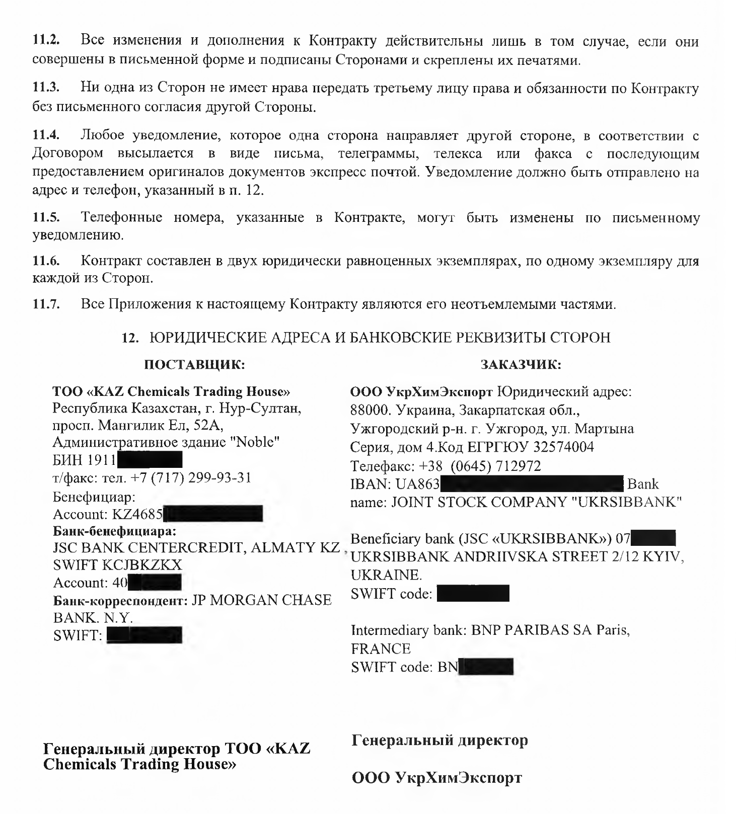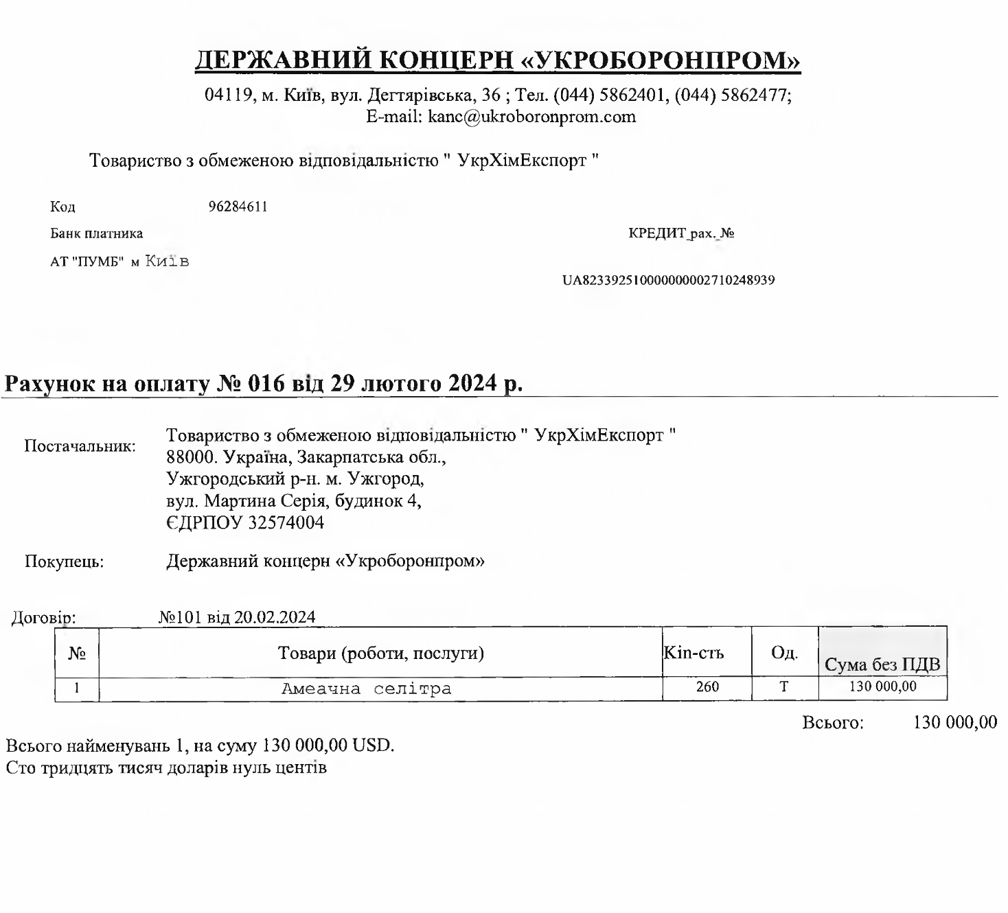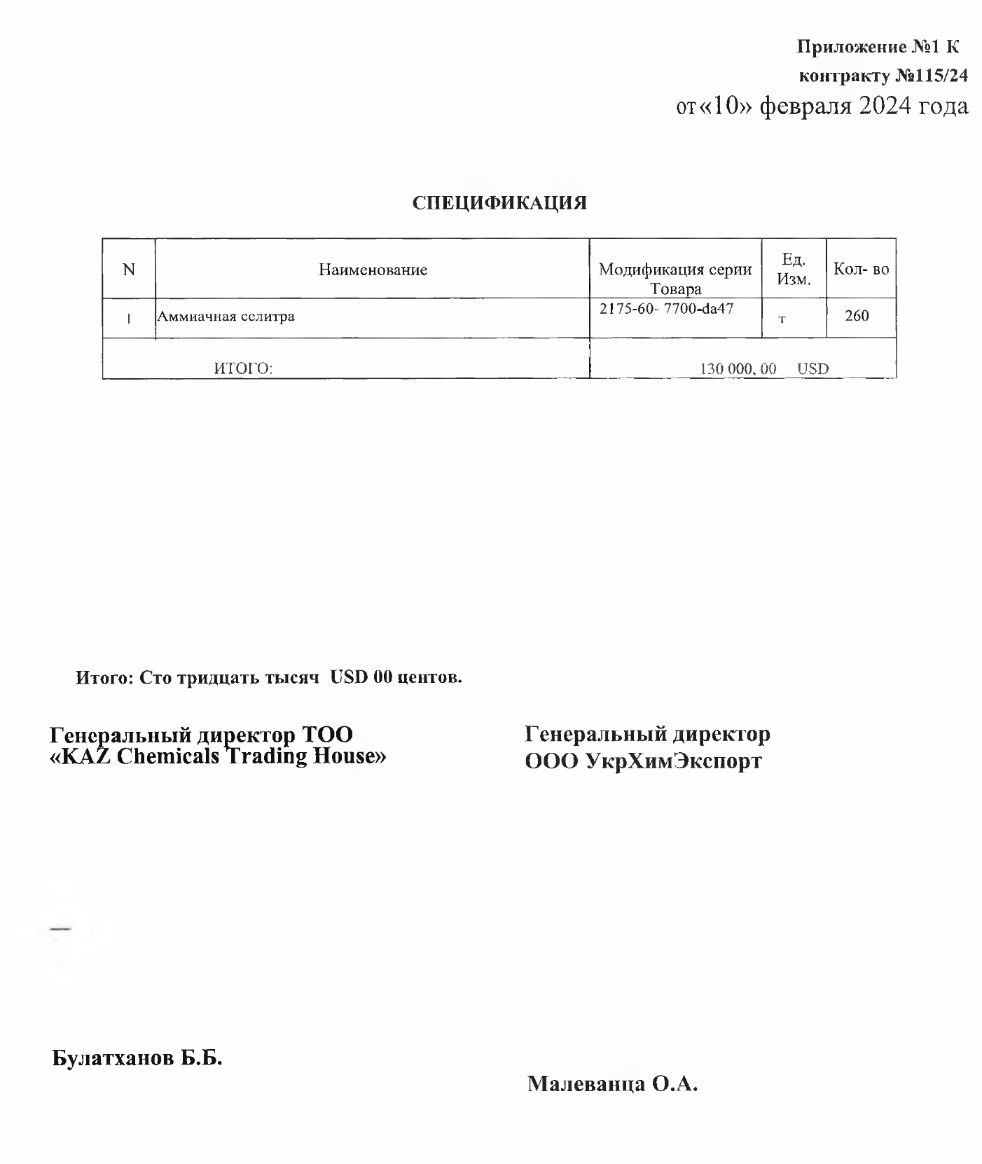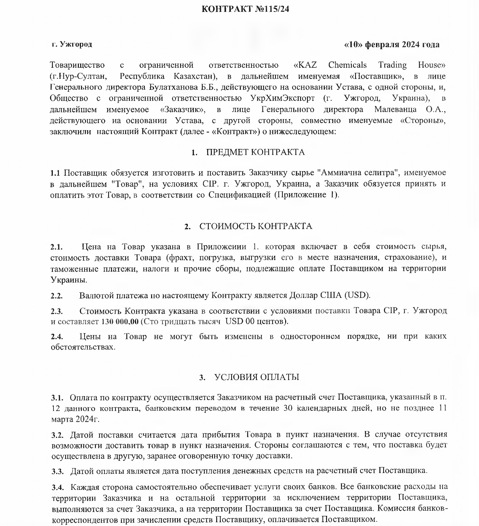 Tarmoqda Ujgorodda imzolangan 2024 yil 10 fevraldagi 115/24-sonli shartnomaning nusxalari paydo bo’ldi. Ushbu hujjatga ko’ra, Qozog’istonning «KAZ Chemicals Trading Haus» korxonasi bosh direktor B. Bulatxanov nomidan ujgoroddagi «Ukrximexprot» MChJni yetkazib berishga va’da berdi, uni Malevansa oroli boshqaradi, 260 tonna ammiakli selitra. Bitim narxi-130 ming dollar